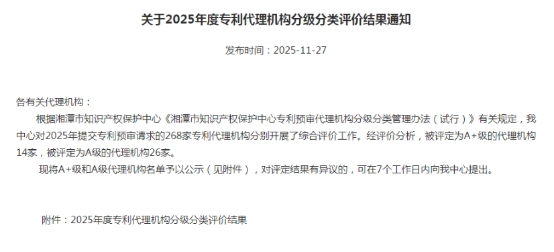 近日,湘潭市知识产权保护中心发布了《关于 2025 年度专利代理机构分级分类评价结果通知》。楚为知识产权代理机构凭借其卓越的专业服务能力、高质量的代理业绩以及优...