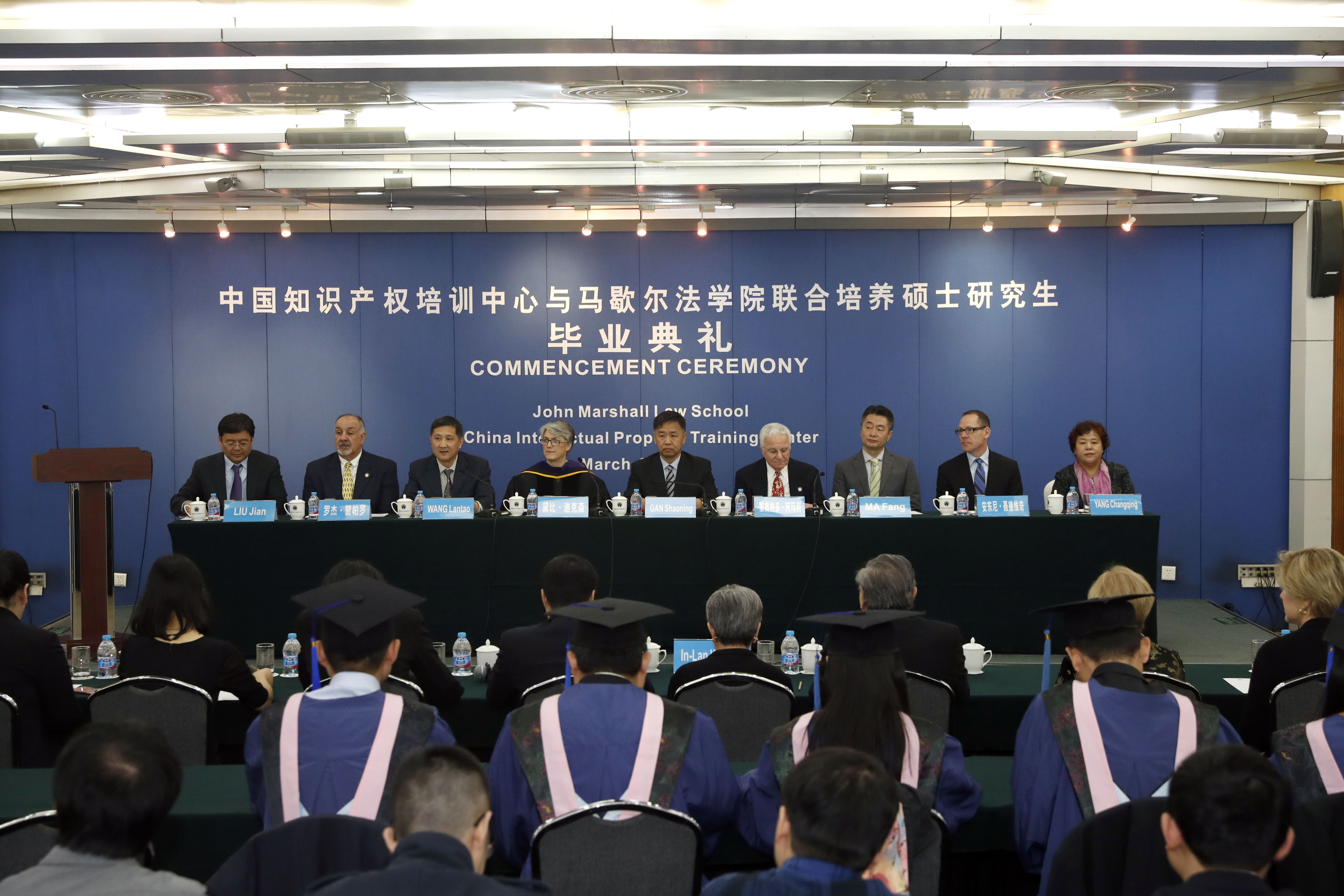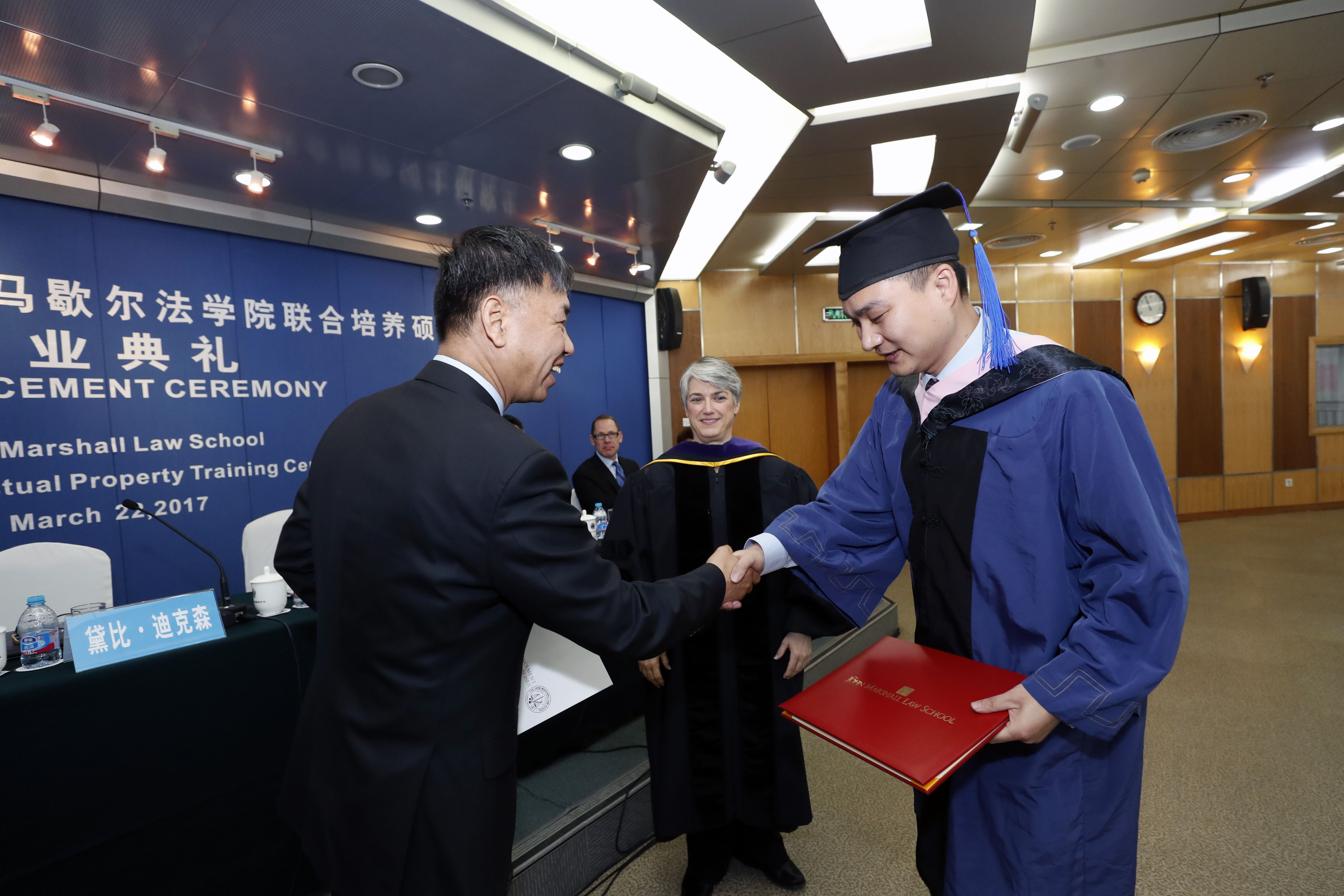 国家知识产权局人事司司长王岚涛主持了本场典礼,国家知识产权局副局长甘绍宁和马歇尔法学院院长黛比•迪克森致辞并共同为学员颁发了学位证书,他们代表全体导师对在座的毕业生们表示了热烈的祝贺,并寄语毕业生要寻找动力来源,激励自己不断前行,在生活、学习中发挥所学,为成就更好的自己而努力,为完成自己担负的职责和事业而奋斗。