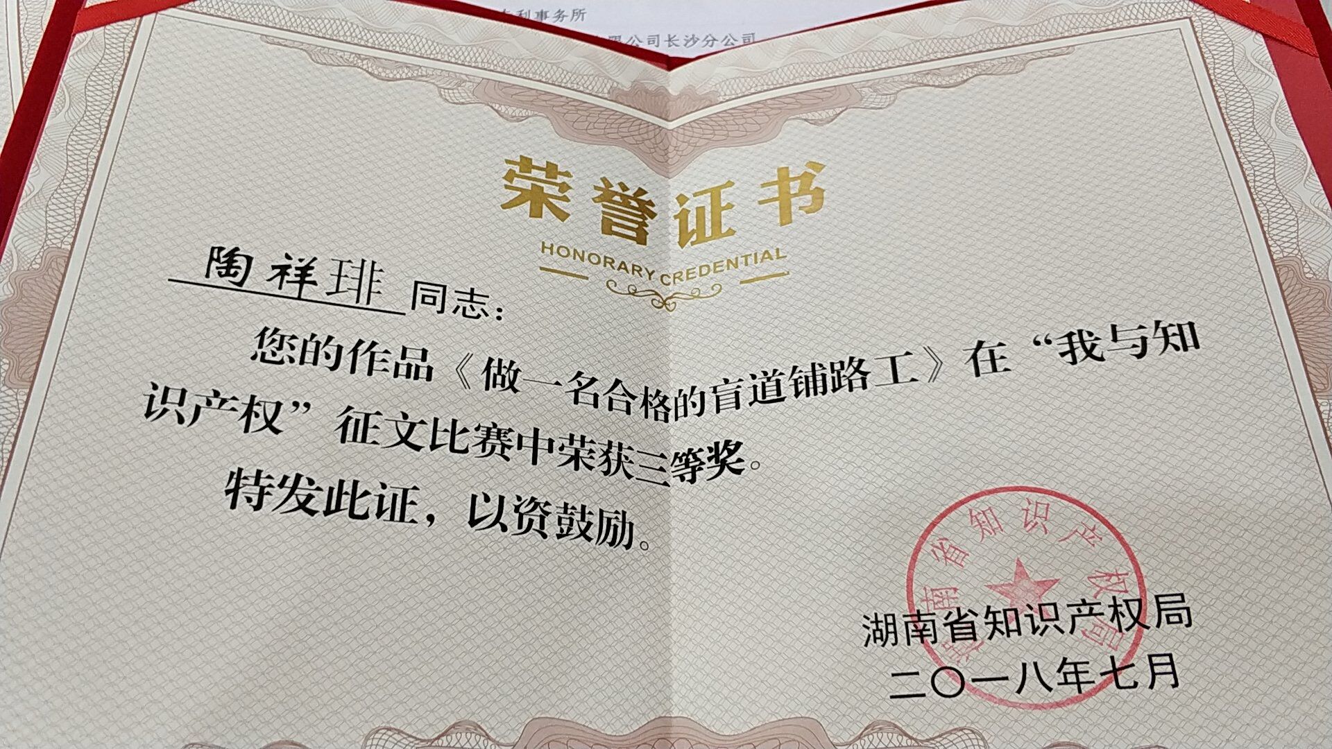来自楚为的两篇文章——《做一名合格的盲道铺路工》与《我与知识产权》从不同的角度分享了知识产权带来的感受,并在“我与知识产权”征文比赛同时荣获三等奖,获得荣誉证书。