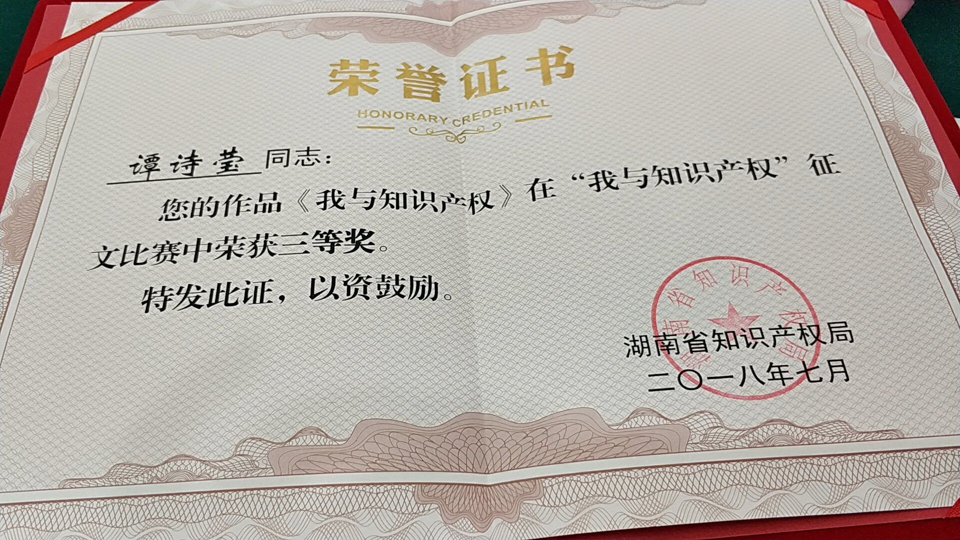 热情祝贺楚为在湖南省“我与知识产权”征文比赛中荣获三等奖