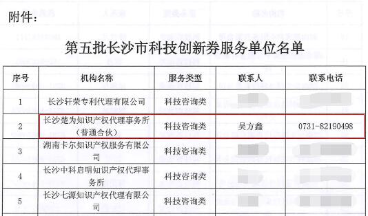 热烈庆祝长沙楚为知识产权代理事务所被长沙市科技局认定为第五批长沙市科技创新券服务单位