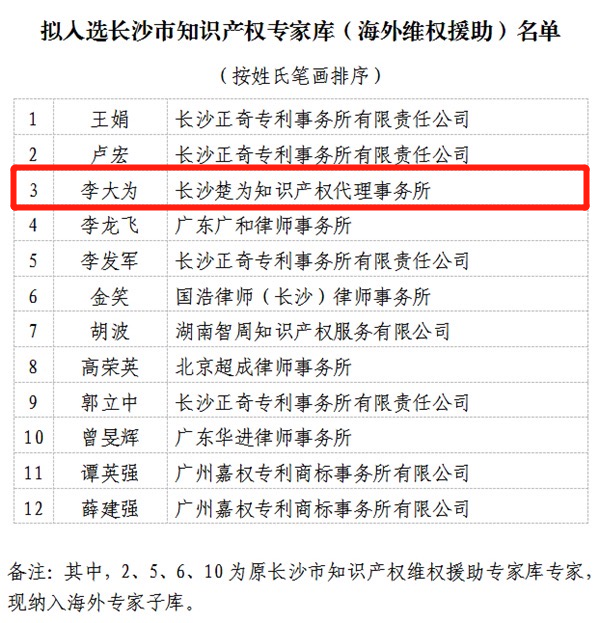 祝贺!我司合伙人李大为拟入选长沙市知识产权专家库(海外维权援助)