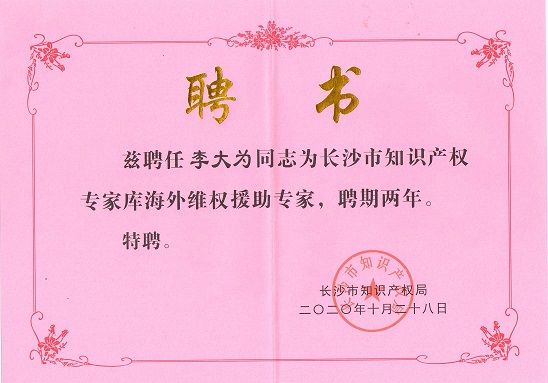 (我司合伙人李大为任长沙市知识产权专家库海外维权援助专家聘书)