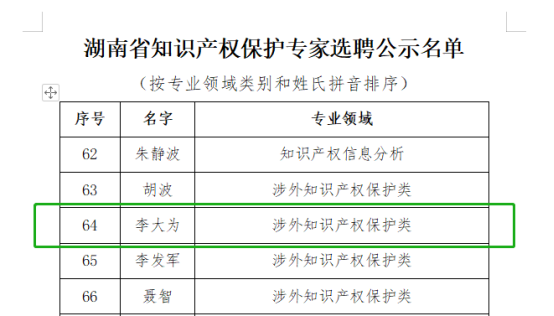 我所合伙人李大为入选湖南省知识产权保护专家拟选聘名单