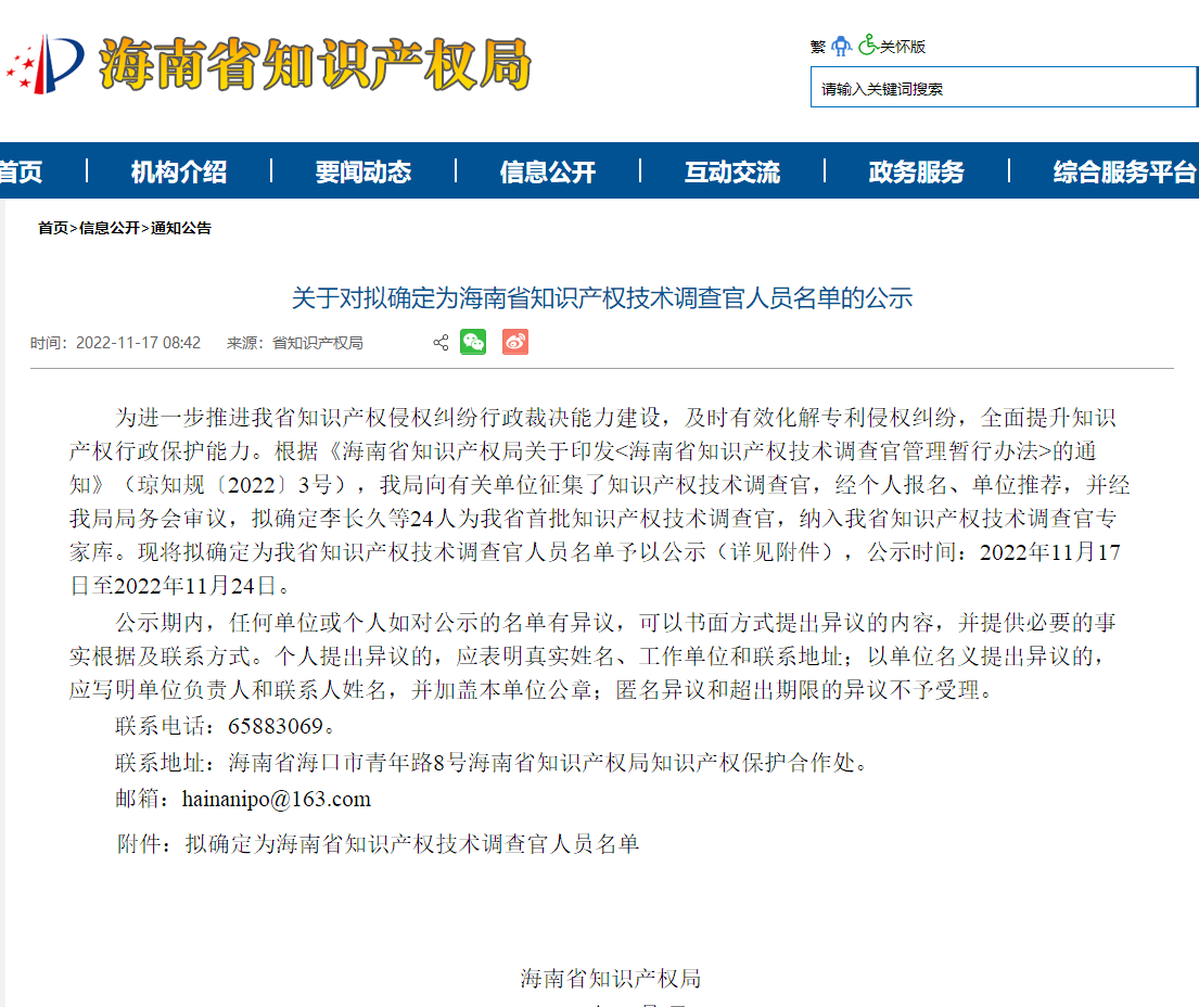 楚为知识产权合伙人李大为成功入选海南省首批知识产权技术调查官